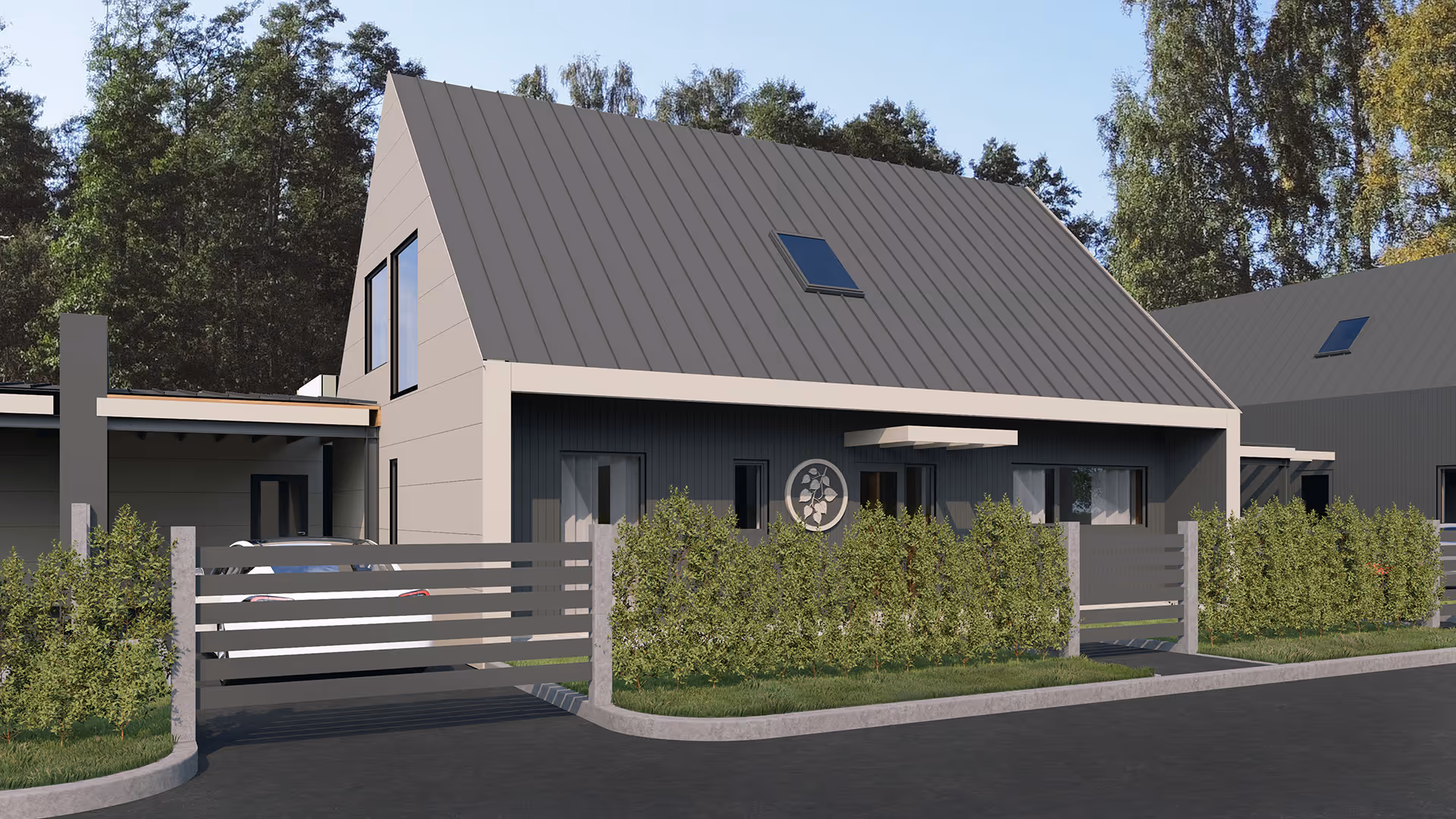 Mājas eksterjers ir paredzēts ar gaišu apdari un panorāmas logiem, kas ļauj baudīt gaismu un dabas skatus, savukārt fasādi rotā terase. Paredzēta atsevišķa telpa mantu glabāšanai, vieta automašīnai kā arī sava zaļā zona. Maksimāls privātums – rindu māju sienas savstarpēji nesaskaras