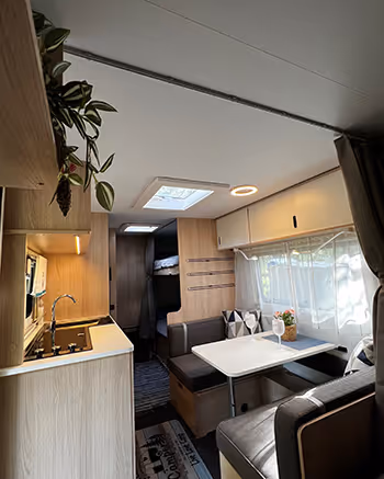 “Saullēkta karavāna” atrodas zaļajā kāpu zonā, priežu koku ielokā, dažu soļu attālumā no jūras krasta